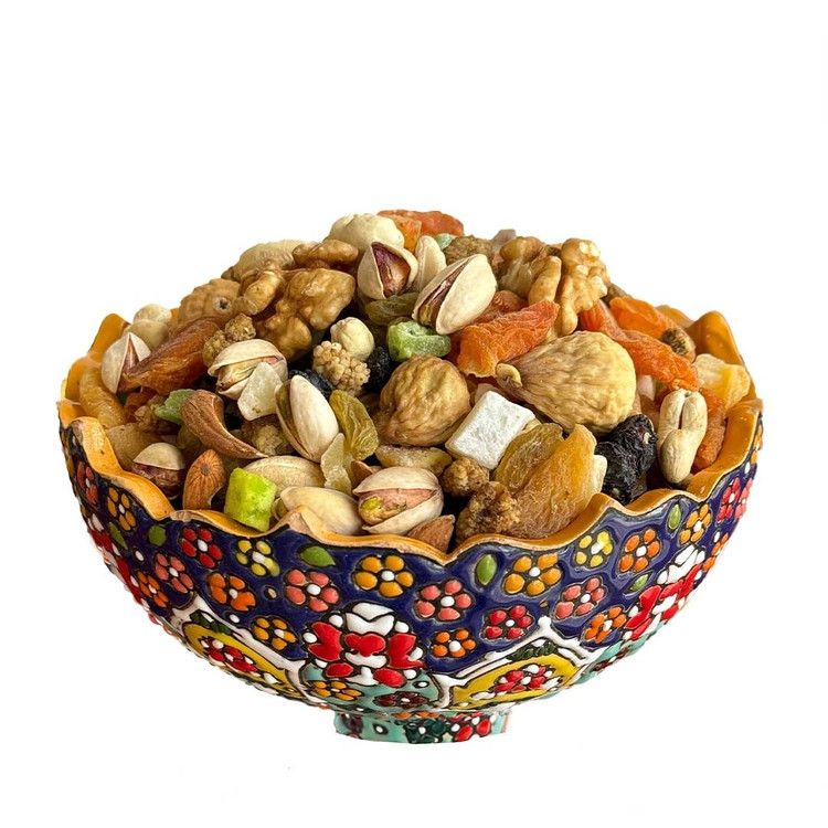 ترکیبات: پسته،بادام هندی،مغز بادام درختی،مویز سیاه بدون هسته،کشمش سبز قلمی،کشمش زرد قلمی،انجیر ۳a،توت خشک،مغز گردو،برگه زردآلو،حبه میوه استوایی