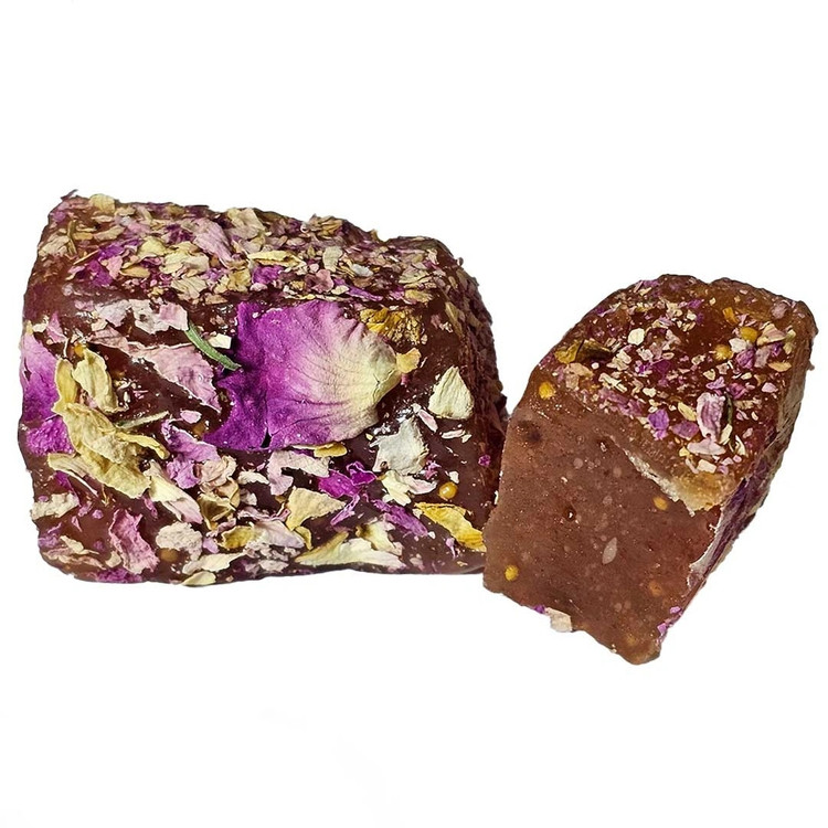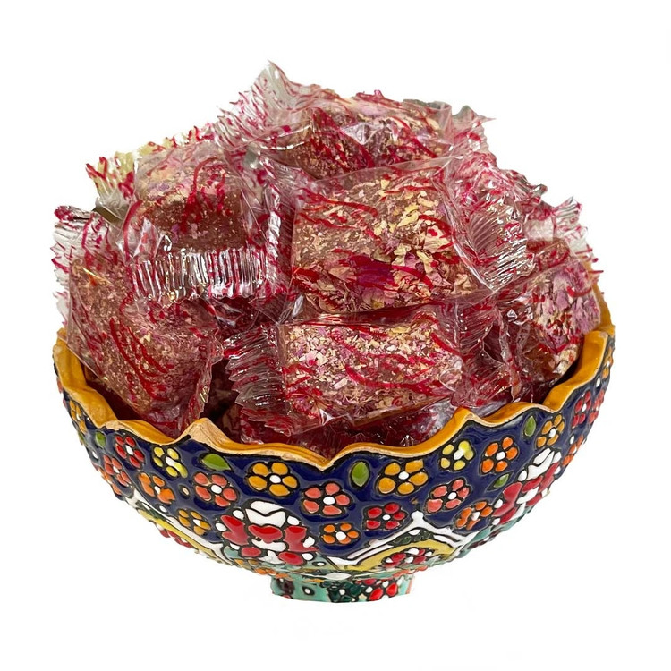 تهیه شده از: از نشاسته، روغن، شکر، زعفران، هل و گلاب و گل محمدی برای طعمدهی و تزئین تهیه شده است. این محصول کم شکر است و با پودر انجیر خشک شیرین شده است.